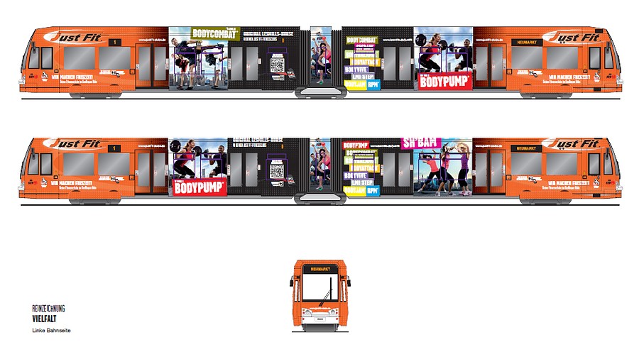 Die Aktion startet mit dem Slogan "Hol' Dir Dein kostenloses Probetraining" und ist auf 3 Jahre angelegt. In dieser Zeit werden vom Aktionspartner jeden Monat neue Fitnessgeschenke und Aktionen realisiert.Ab Juli bereichert die erste "Fitnessbahn" das Kölner Stadtbild auf den Nord-Süd Linien 16 bzw. 18. Die zweite Bahn wird ab August auf einer der West-Ost Linien fahren. Just Fit und LES MILLS haben sich diese "Hingucker" bei den Kölner Verkehrsbetrieben für insgesamt drei Jahre gesichert.